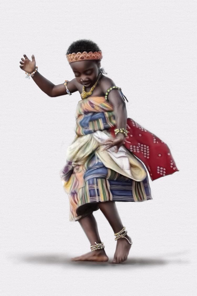 Celebrate the beauty of African heritage with this vibrant artwork featuring a young child dressed in traditional African attire. The youth is adorned in a colorful, multi-patterned skirt with bold shades of blue, red, yellow, and white, complemented by layered beaded necklaces, arm bands, bracelets, and ankle adornments. A striking reddish-orange crown-like headpiece adds regal presence, while the dynamic dance-like pose captures movement, rhythm, and cultural spirit. Perfect for collectors of African-inspired art, cultural wall décor, and statement pieces that honor tradition and storytelling. This piece makes a meaningful addition to any home, office, or gallery space.