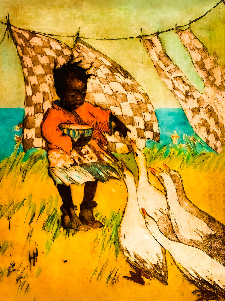 Bring warmth and serenity to your space with this charming wall art. This artwork captures a tender moment of a young child feeding geese by a peaceful lakeside, bathed in soft golden sunlight. The vibrant orange of the child’s outfit contrasts beautifully with the white and black geese, while the rustic countryside backdrop of cloth drying on wooden poles and calm water evokes simplicity, ure lovers, this printable artwork adds a touch of calm nostalgia to any home.