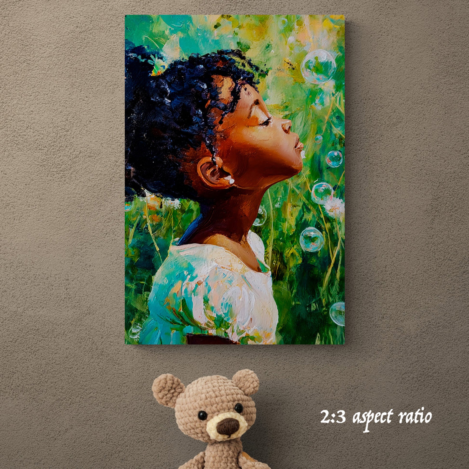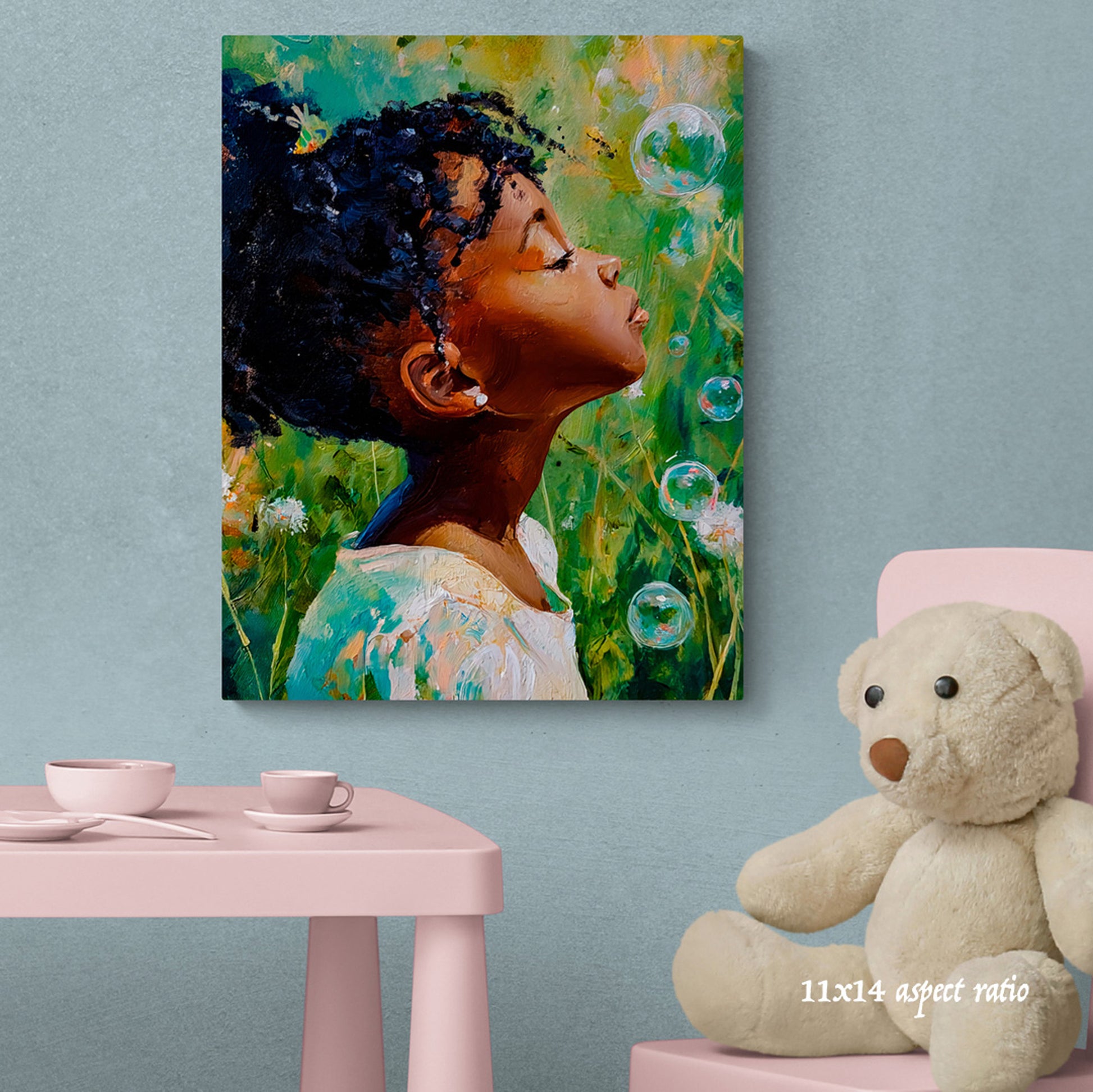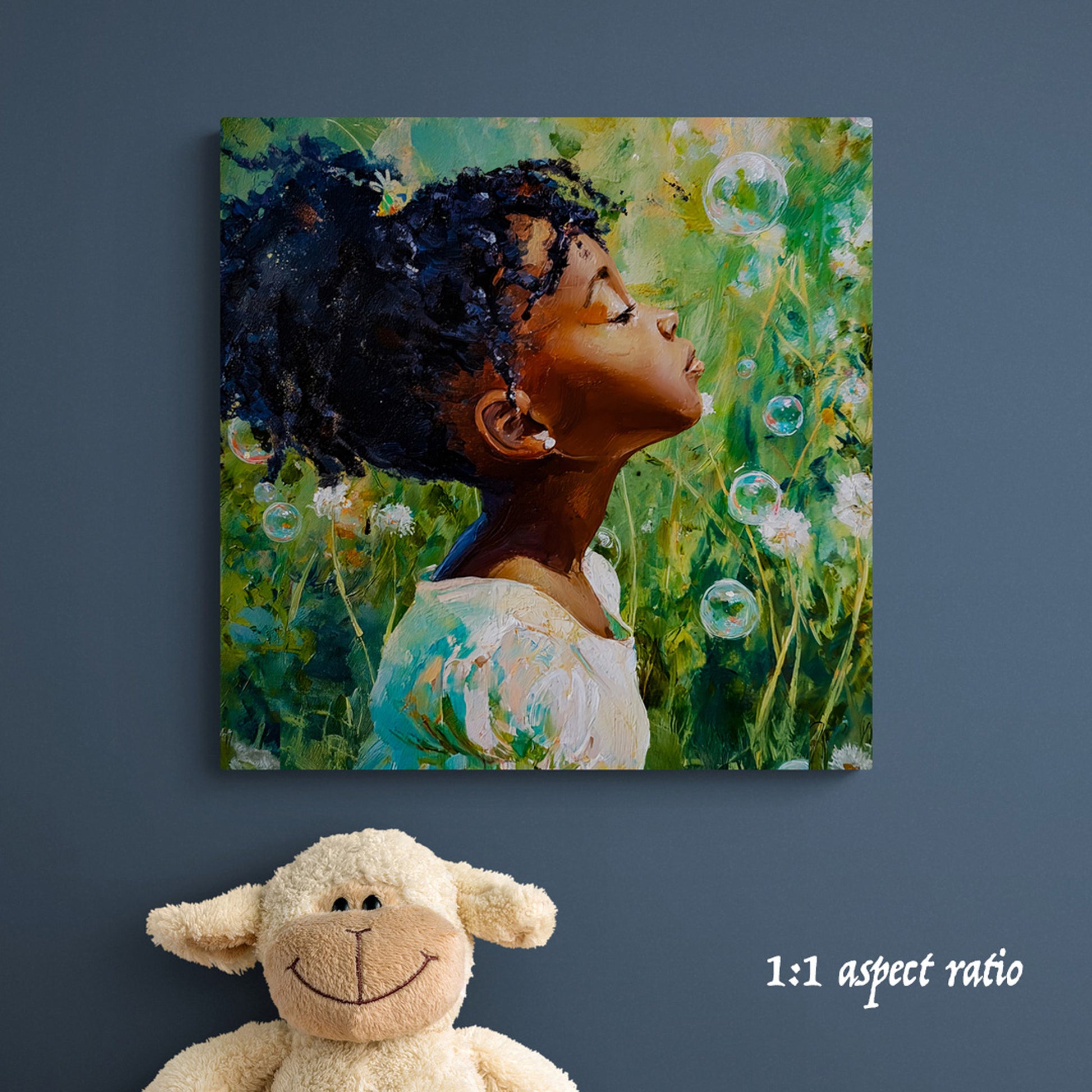 Bring joy, innocence, and childlike wonder into your home with this vibrant impressionist painting of a young girl blowing bubbles in a lush field of flowers. Painted in expressive brushstrokes with warm greens, whites, and yellows, this artwork captures a carefree moment of play and connection with nature. The girl, dressed in a flowing white dress with natural curls adorned with bows, stands surrounded by dandelions and glowing light, creating a scene filled with beauty, freedom, and nostalgia. Perfect wall art for nurseries, playrooms, living spaces, or as a unique gift for art lovers who appreciate expressive impressionism and uplifting, colorful decor.
