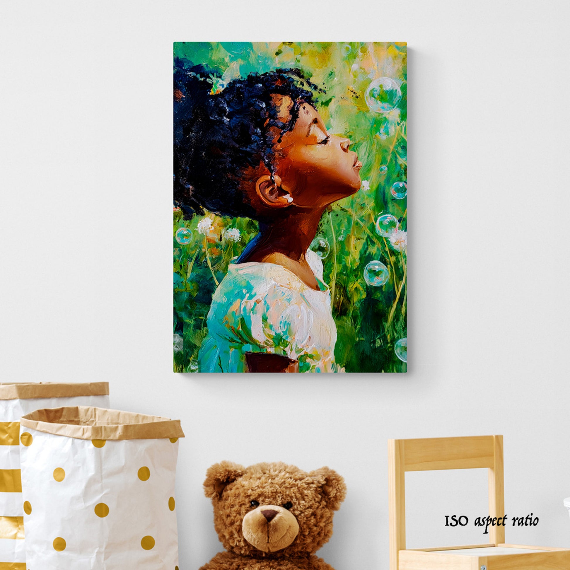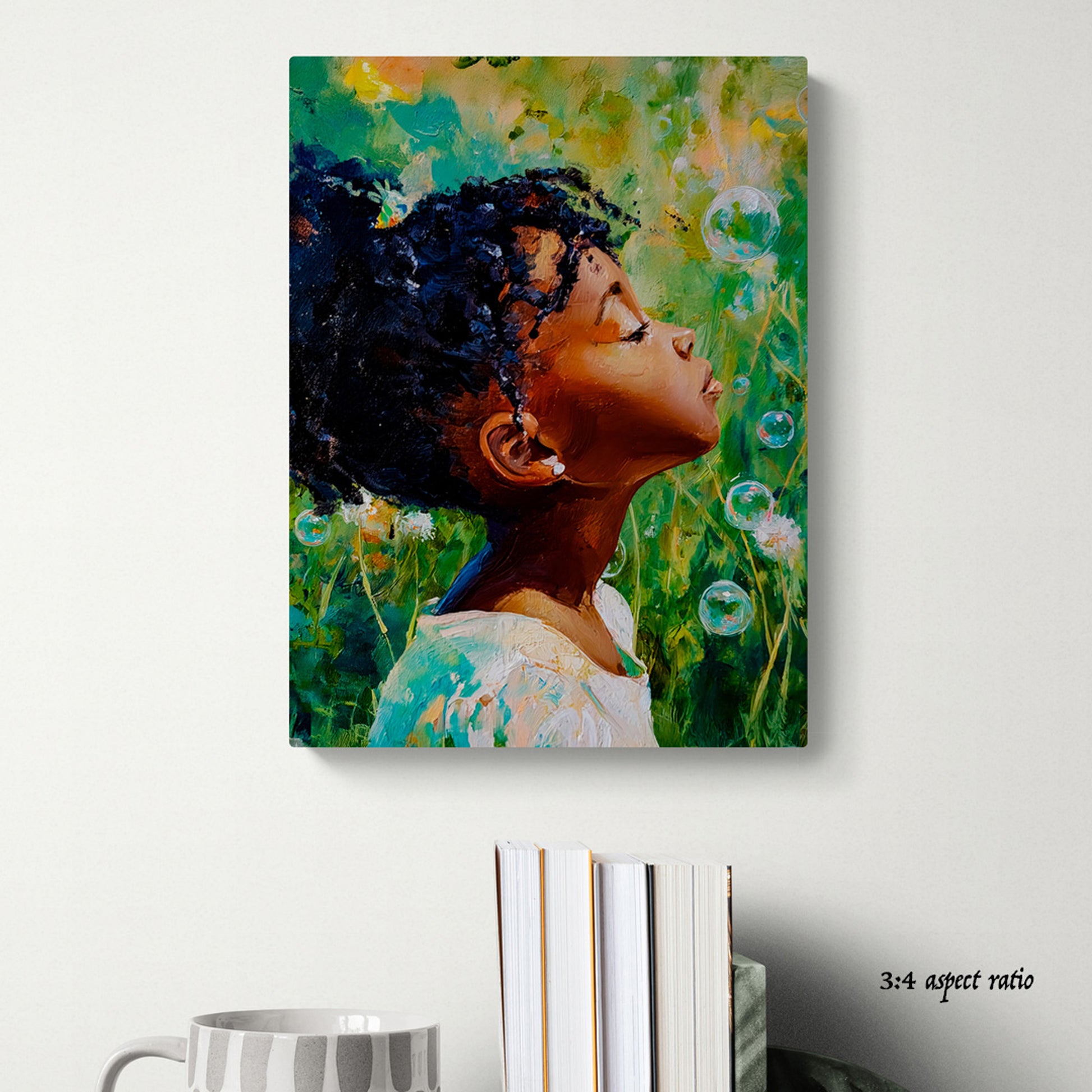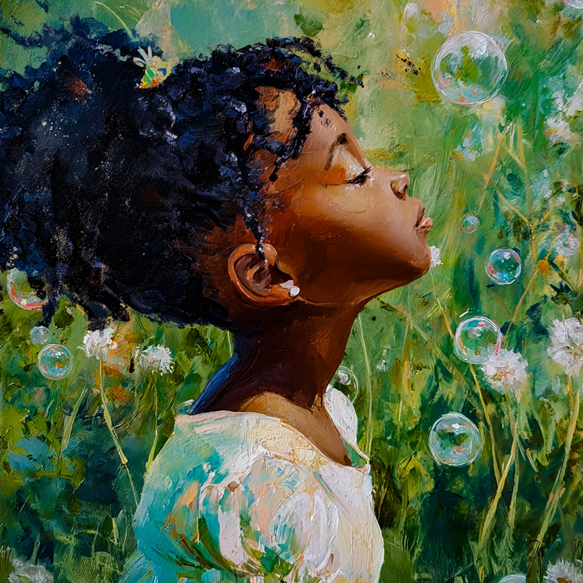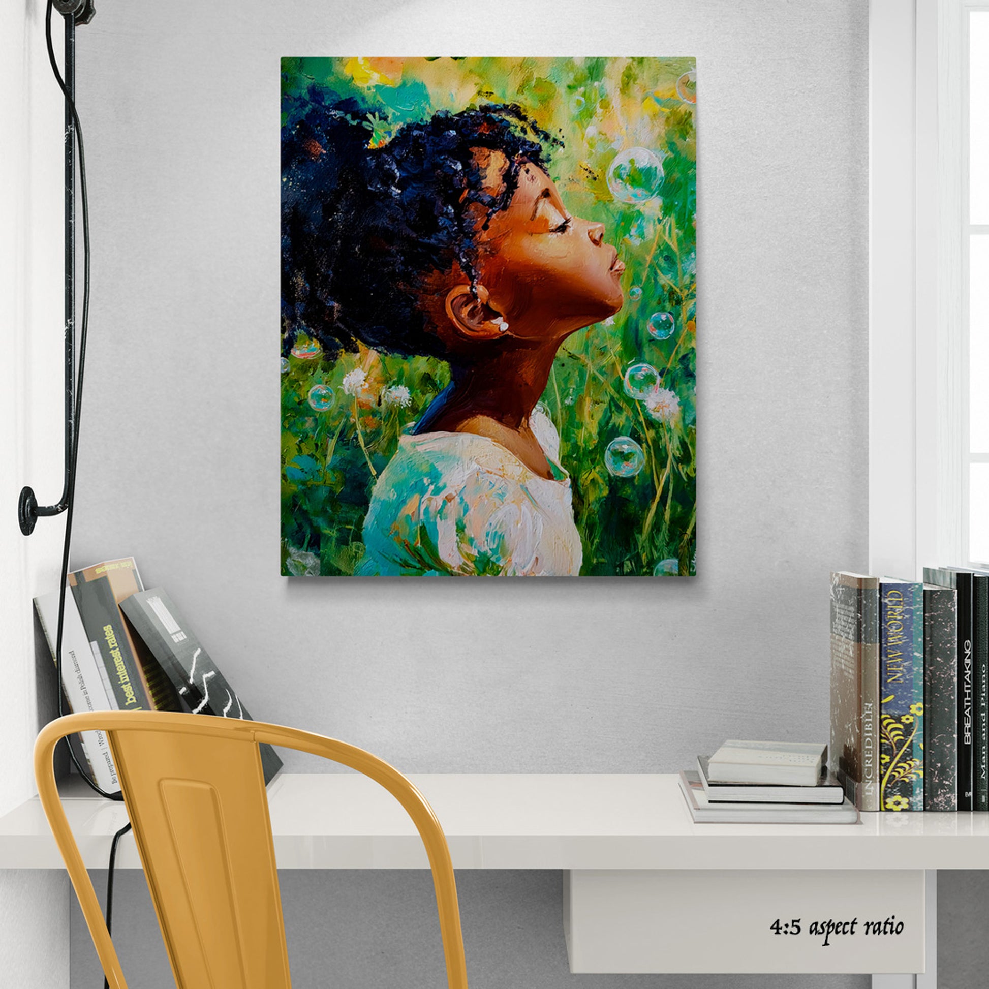 Bring joy, innocence, and childlike wonder into your home with this vibrant impressionist painting of a young girl blowing bubbles in a lush field of flowers. Painted in expressive brushstrokes with warm greens, whites, and yellows, this artwork captures a carefree moment of play and connection with nature. The girl, dressed in a flowing white dress with natural curls adorned with bows, stands surrounded by dandelions and glowing light, creating a scene filled with beauty, freedom, and nostalgia. Perfect wall art for nurseries, playrooms, living spaces, or as a unique gift for art lovers who appreciate expressive impressionism and uplifting, colorful decor.