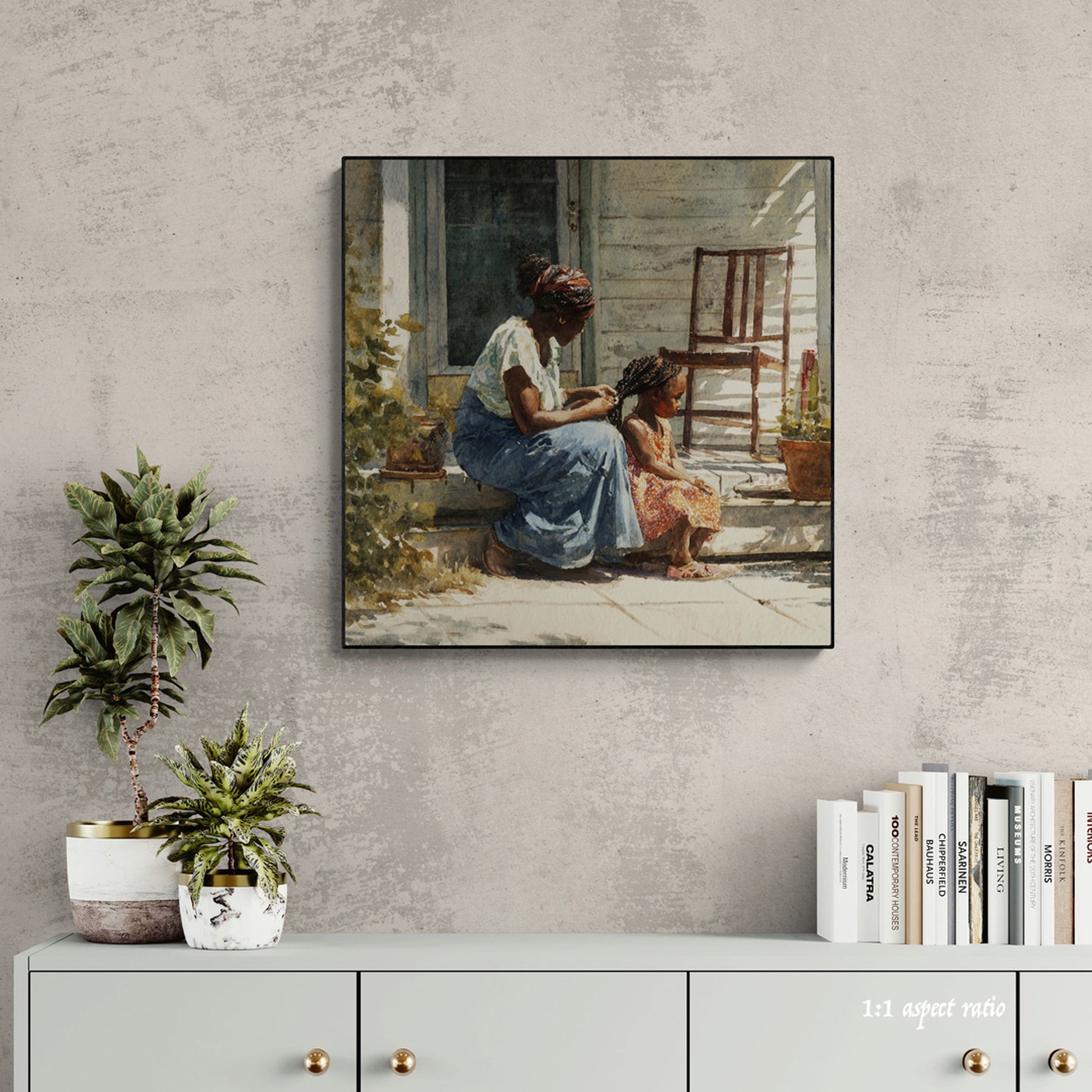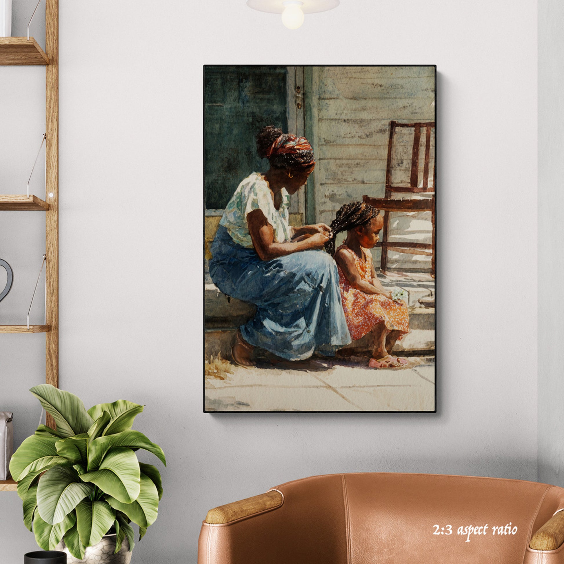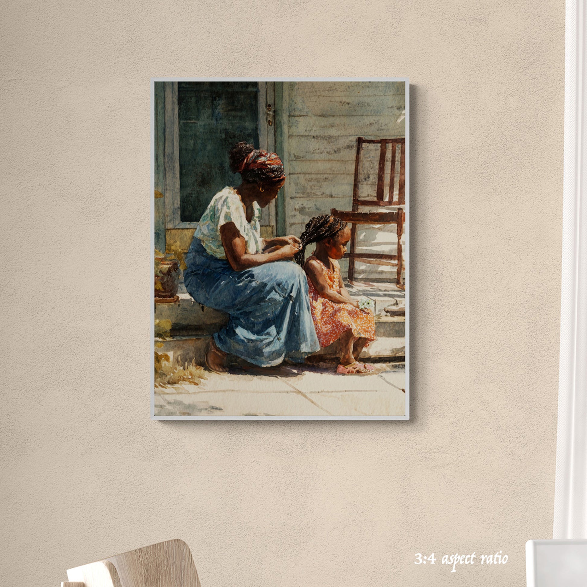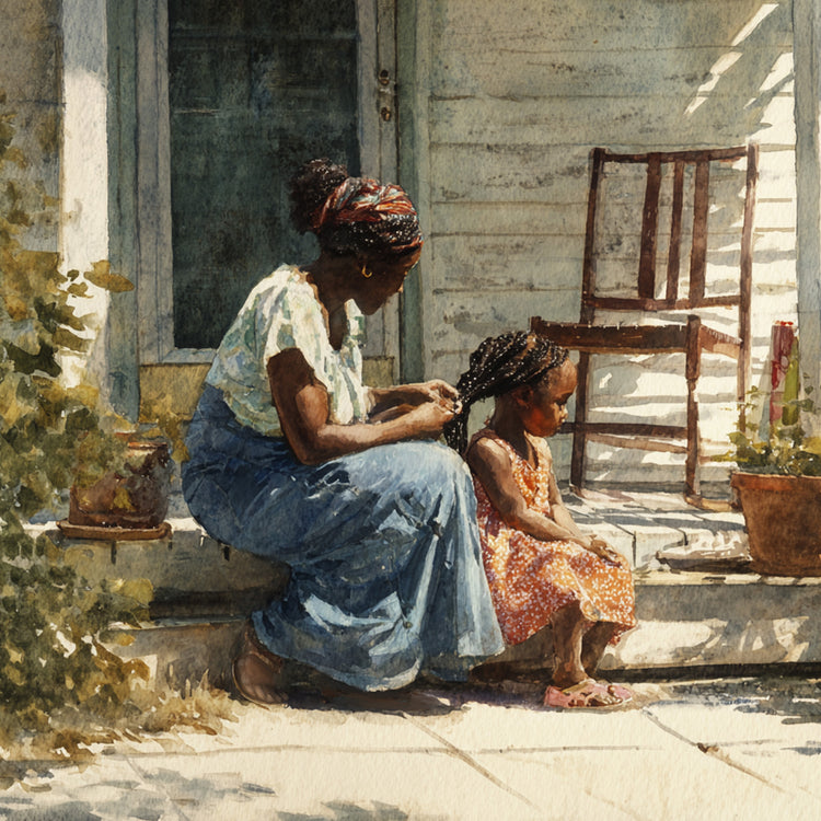 Capture the warmth of family love with this intimate watercolor painting of a mother and child. Set on a rustic porch bathed in soft sunlight, this artwork beautifully highlights maternal affection, serenity, and everyday simplicity. The mother, dressed in a flowing skirt and vibrant headscarf, sits in harmony beside her child, who glows in a bright orange dress. Weathered wood, lush potted plants, and dappled sunlight add rustic charm to this tender scene. Perfect for home décor, nursery walls, or as a heartfelt gift for Mother’s Day, this print celebrates connection, warmth, and timeless love.
