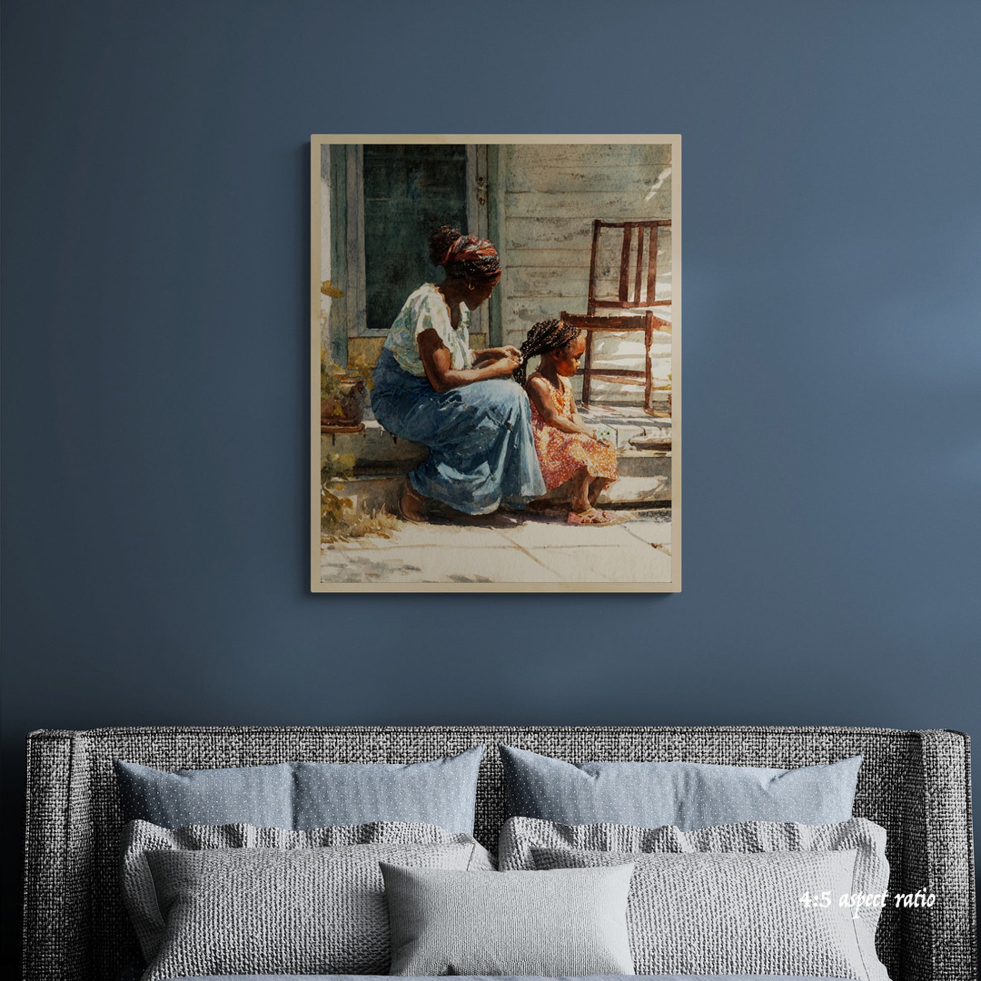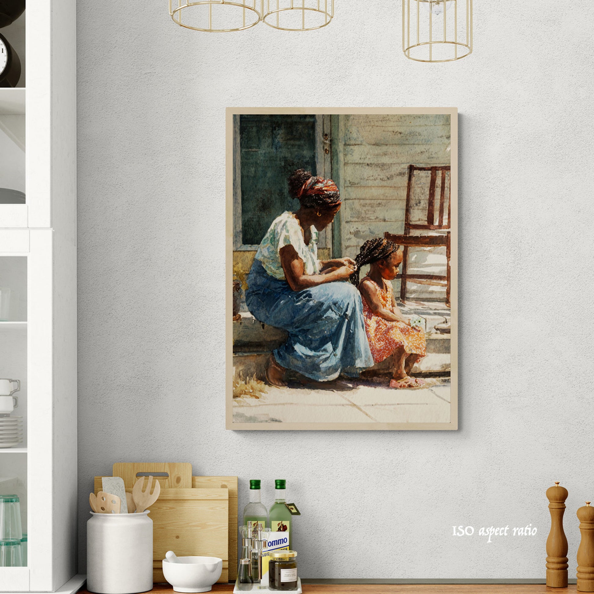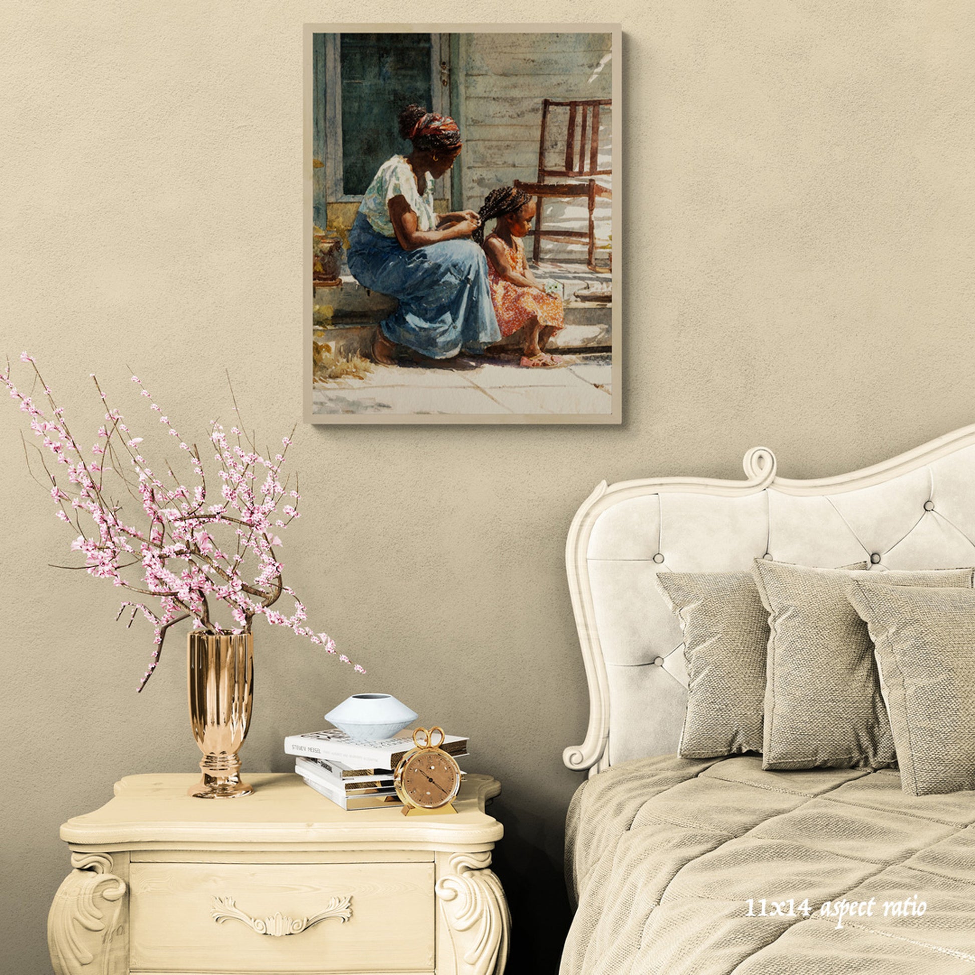 Capture the warmth of family love with this intimate watercolor painting of a mother and child. Set on a rustic porch bathed in soft sunlight, this artwork beautifully highlights maternal affection, serenity, and everyday simplicity. The mother, dressed in a flowing skirt and vibrant headscarf, sits in harmony beside her child, who glows in a bright orange dress. Weathered wood, lush potted plants, and dappled sunlight add rustic charm to this tender scene. Perfect for home décor, nursery walls, or as a heartfelt gift for Mother’s Day, this print celebrates connection, warmth, and timeless love.
