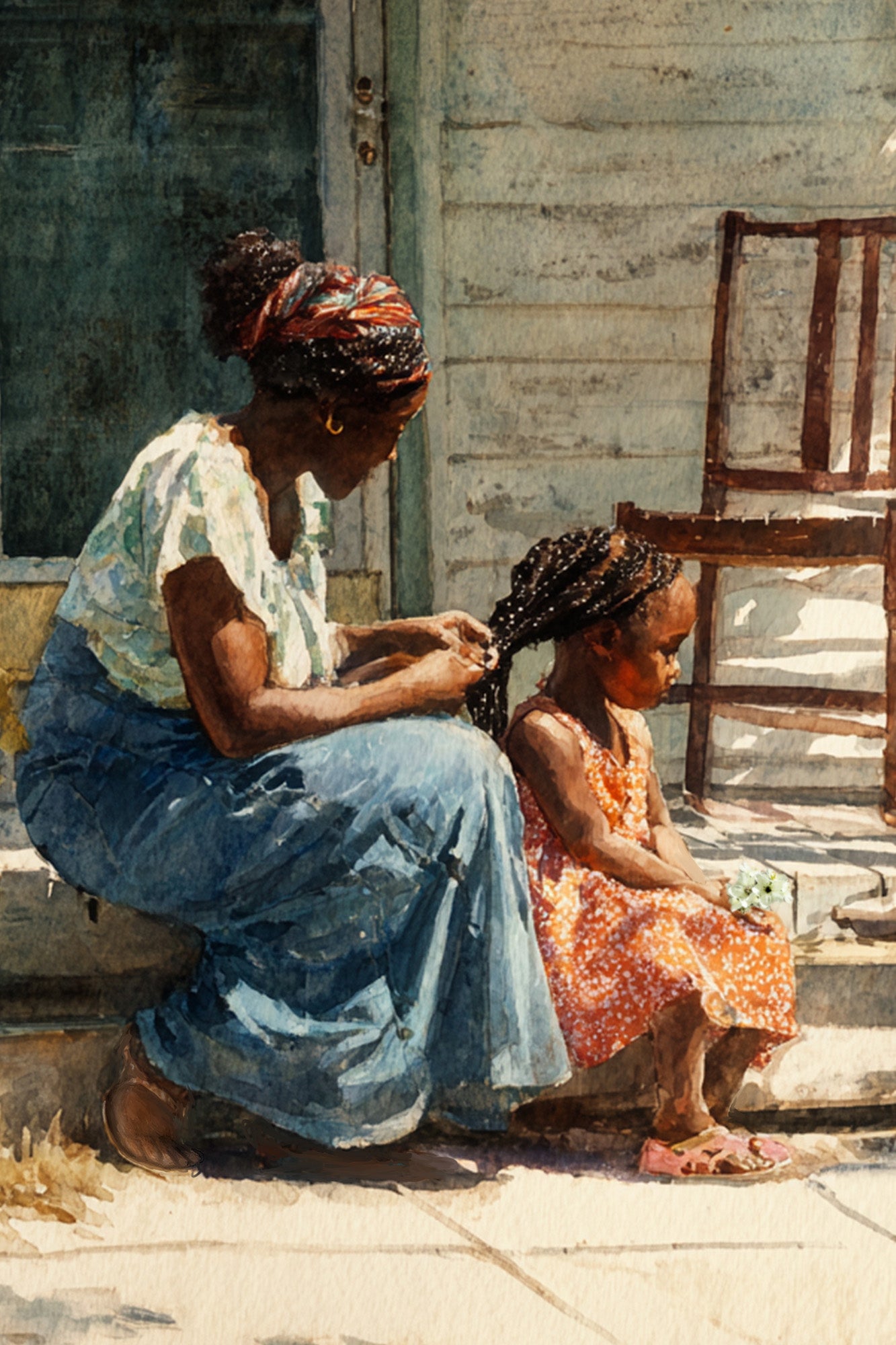 Capture the warmth of family love with this intimate watercolor painting of a mother and child. Set on a rustic porch bathed in soft sunlight, this artwork beautifully highlights maternal affection, serenity, and everyday simplicity. The mother, dressed in a flowing skirt and vibrant headscarf, sits in harmony beside her child, who glows in a bright orange dress. Weathered wood, lush potted plants, and dappled sunlight add rustic charm to this tender scene. Perfect for home décor, nursery walls, or as a heartfelt gift for Mother’s Day, this print celebrates connection, warmth, and timeless love.
