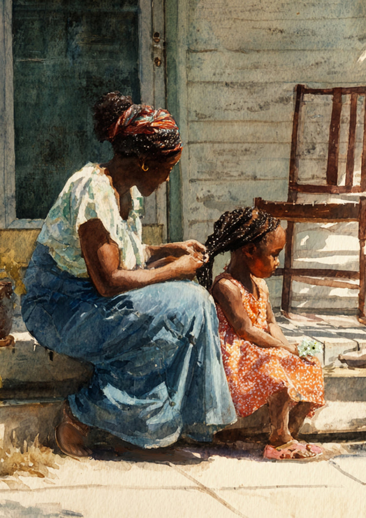 Capture the warmth of family love with this intimate watercolor painting of a mother and child. Set on a rustic porch bathed in soft sunlight, this artwork beautifully highlights maternal affection, serenity, and everyday simplicity. The mother, dressed in a flowing skirt and vibrant headscarf, sits in harmony beside her child, who glows in a bright orange dress. Weathered wood, lush potted plants, and dappled sunlight add rustic charm to this tender scene. Perfect for home décor, nursery walls, or as a heartfelt gift for Mother’s Day, this print celebrates connection, warmth, and timeless love.
